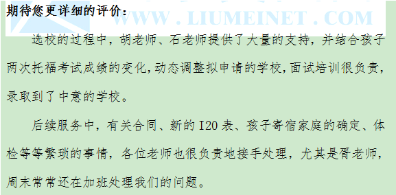 2017年的申請(qǐng)落下了帷幕,留美網(wǎng)非常高興,感謝各位家長(zhǎng)一直以來的支持和信任,今年我們創(chuàng)走了一個(gè)又一個(gè)的補(bǔ)錄奇跡,在補(bǔ)錄階段,還為很多學(xué)生申請(qǐng)到了頂尖寄宿,以及加州頂尖藝術(shù)學(xué)校,還有一些頂尖走讀,這些離不開家長(zhǎng)的支持,也離不開留美網(wǎng)各位同仁的辛苦和付出,今年是收獲的一年,我們收獲了學(xué)生的未來,也收獲了家長(zhǎng)的信任,很多家長(zhǎng)對(duì)我們的工作給予了支持和肯定,下面就一起看看學(xué)生家長(zhǎng)的反饋!