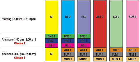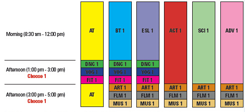 AT:學術(shù)課程 BT:商務(wù)課程 ESL:語言課程 ACT:表演課程 SCI:科學課程 ADV:冒險課程 DNC:跳舞 YOG:瑜伽 FIT:健身 ART;藝術(shù) FLM:電影/攝影 MUS;音樂