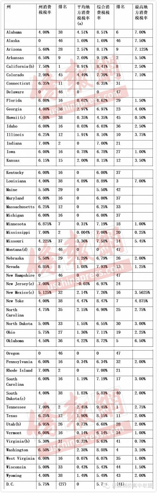 b.該三州在州稅的基礎(chǔ)上,征收強(qiáng)制的、全州范圍的地方附加消費(fèi)稅,加州為1%,猶他為1.25%,弗吉尼亞為1%,此項(xiàng)附加消費(fèi)稅已被算入州消費(fèi)稅中。