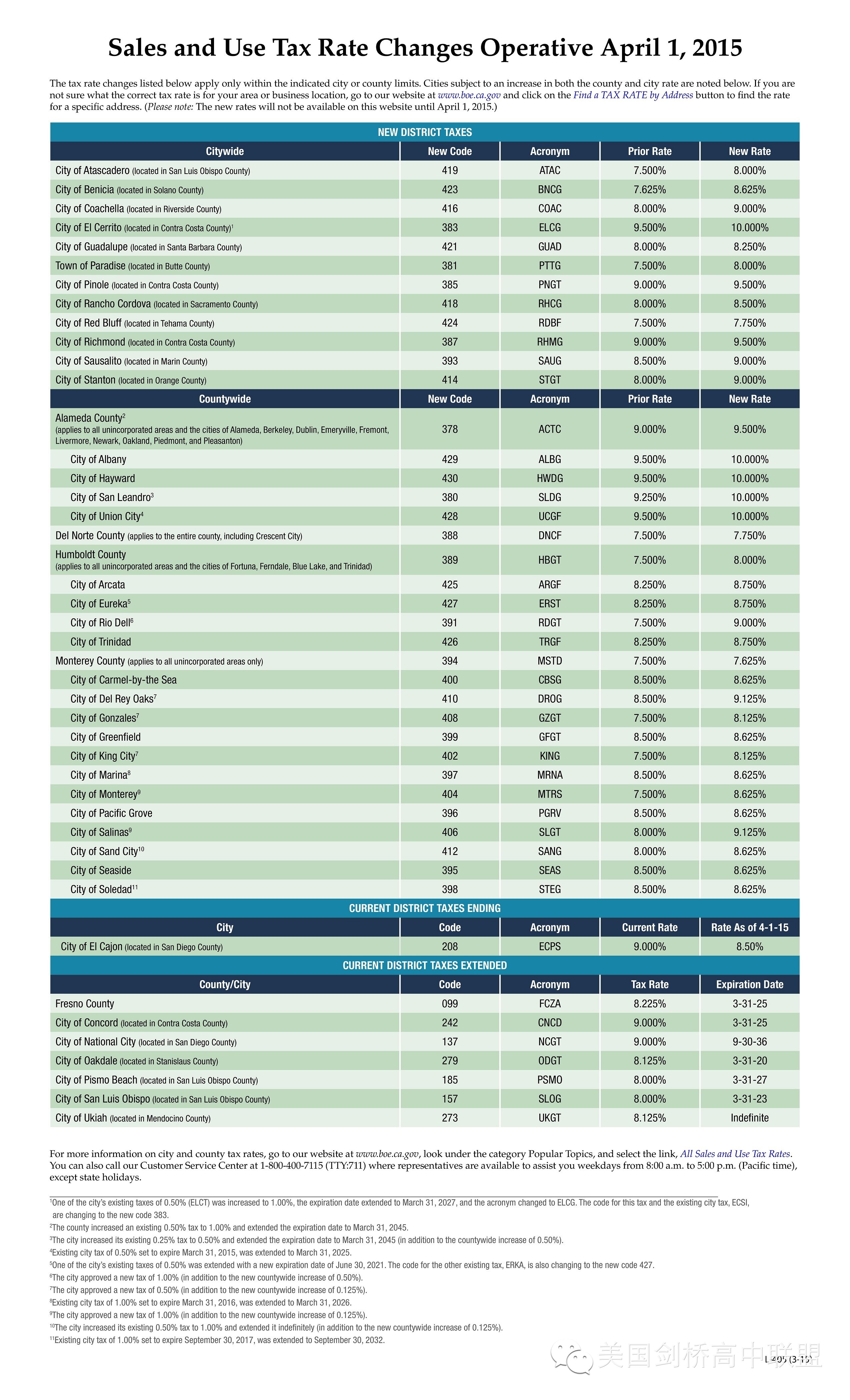 加州稅章審查委員會(huì)上月宣布,加州的消費(fèi)及使用稅將于2015年4月1日起進(jìn)行上調(diào)。不同地區(qū)上調(diào)幅度不同,最高的將升至10%。從此,在加州的生活費(fèi)又將上升到一個(gè)新高度了。以下是官方提供的按照地區(qū)所列稅率調(diào)整表格。