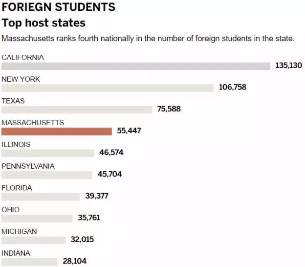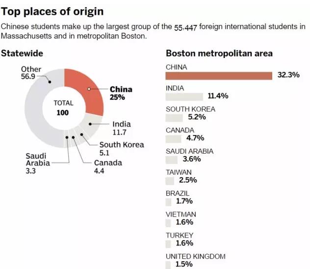 馬薩諸塞州的留學(xué)生們有25%,共55447人來自中國,印度人緊隨其后,占11%,再加上韓國,加拿大,沙特這些國家來的學(xué)生,總共為該州貢獻(xiàn)了約22億美元的GDP。