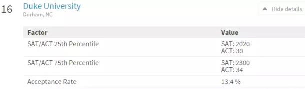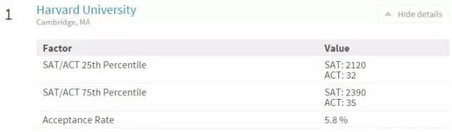 之前我們曾經說過,美國各個大學有著獨特的錄取標準。最近,美國的學術機構也評選出最難申請的20所美國大學,評價標準包括錄取率(占60%比重)和所錄取學生的SAT/ACT成績水平(占40%比重),哈佛大學以5.8%的錄取率和2120-2390分的SAT主體分數(shù)獲得了全美國最申請的大學桂冠。