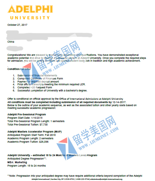 恭喜W同學(xué)成功獲得Adelphi University研究生錄取offer!這個offer來之不易,凝聚了留美網(wǎng)全體員工的努力!文案老師通過與學(xué)生深切溝通,挖掘出學(xué)生的亮點和特色,文書和推薦信也寫的非常出彩,贏得了招生官的青睞,感謝留美網(wǎng)的全體員工,在這里也祝愿W同學(xué)在美國前程似錦,展翅高飛!想申請美國留學(xué)的同學(xué)可以馬上咨詢:400-000-7805,010-65183908,微信:liumeinet2014