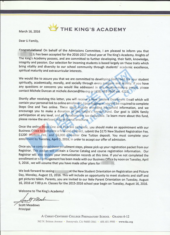 經(jīng)過了一系列的文書申請,考卷測試和學校面試,留美網(wǎng)李同學終于被美國優(yōu)質走讀中學國王學院錄取啦~