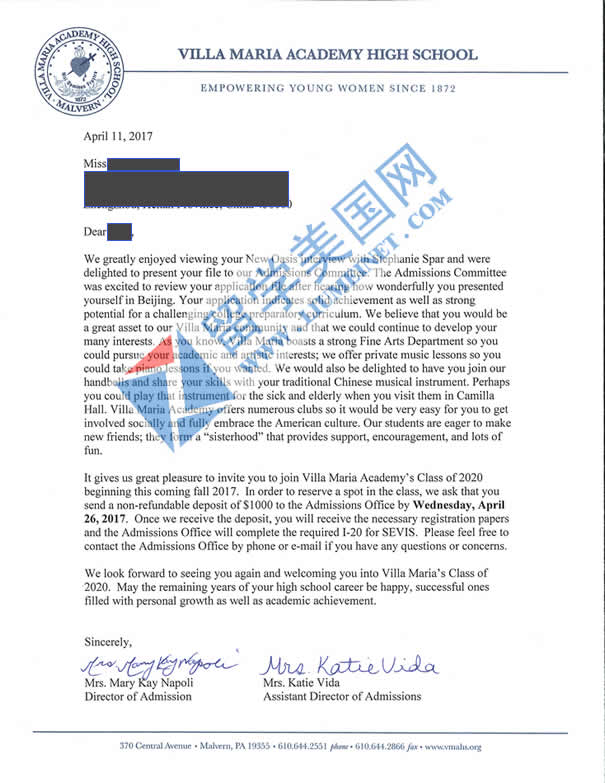 恭喜WYX同學(xué)獲得Villa Maria Academy High School 維拉瑪利亞學(xué)院錄取