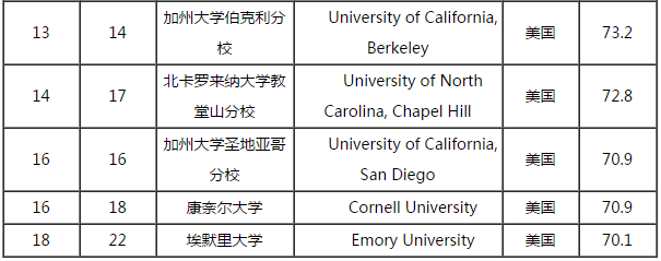 進入排名11-20的院校共有7所,分別是斯坦福大學、約翰霍普金斯大學、加州大學伯克利分校、北卡羅來納大學教堂山分校、加州大學圣地亞哥分校、康奈爾大學和埃默里大學。其中埃默里大學進步4名,從去年的第22名上升到今年的第18名。