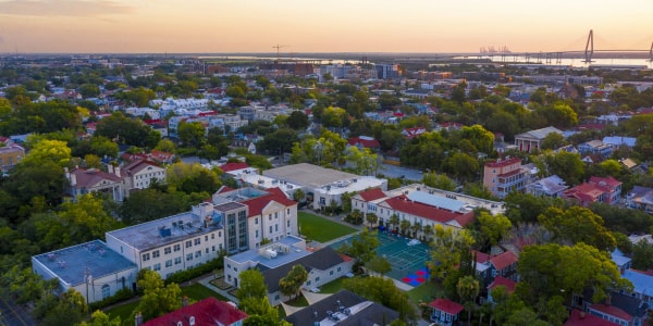 學校位于南卡羅萊納州的海濱城市查爾斯頓,是科佩爾(COOPER)河與阿什利(Ashley)河匯合處,在查爾斯頓灣的頂端,瀕臨大西洋的西側(cè),是南卡羅萊納州的主要港口,也是美國第四大國際港口。查爾斯頓是美國歷史名城之一,每年都吸引大量游客,這里有美國最早的海關(guān),美國最早的販賣黑奴交易市場,美國南北戰(zhàn)爭紀念碑,還有歷史悠久的古炮臺。這里是美國最大的軍港之一,著名的第七艦隊的航空母艦等百艘軍艦都停泊在海灣,游人可以在軍港海軍導游引導下坐車游覽。