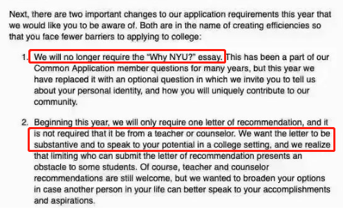 這么一看,感覺(jué)哪里都走不通呢……但其實(shí),紐大的入學(xué)規(guī)則調(diào)整已經(jīng)指明了方向。除標(biāo)化成績(jī),公告還有兩個(gè)重要變化:一是,取消了數(shù)十多年來(lái)的祖?zhèn)魉嚹?為什么選紐約大學(xué)"的文書。取而代之的是新的文書題目:“請(qǐng)告訴我們你的個(gè)人身份,以及你的經(jīng)歷將如何為我們做出獨(dú)特的貢獻(xiàn)” 。二是,從今年開(kāi)始,推薦信不要求來(lái)自老師或班主任,只要推薦人足夠了解學(xué)生的個(gè)人能力和特點(diǎn),并以此來(lái)說(shuō)明申請(qǐng)人的未來(lái)潛力就可以。