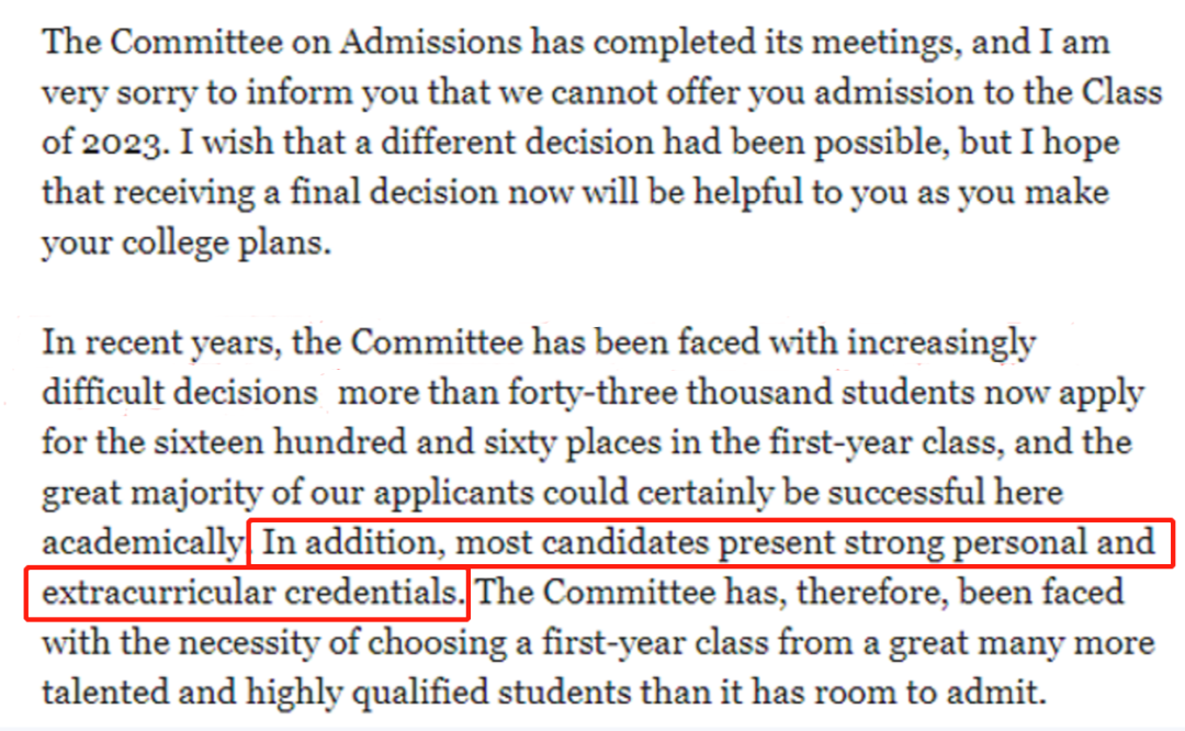 言外之意,你要在個(gè)人能力展示+對(duì)社會(huì)的貢獻(xiàn)+未來(lái)發(fā)展?jié)摿ι细裢獍l(fā)力了。事實(shí)也確實(shí)如此,今年哈佛大學(xué)和帝國(guó)理工學(xué)院的拒信里,就已經(jīng)明確寫了: