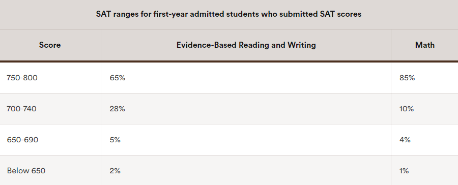 95%被錄取的新生在原高中班級排名前10%。標(biāo)化成績方面,和賓大一樣,布朗實施的是Test-Optional政策,但官方還是公布了新生的ACT/SAT成績:SAT成績中位數(shù)區(qū)間為1500-1570;ACT成績中位數(shù)區(qū)間為34-26,對于國際學(xué)生來說,最好成績要達(dá)到SAT1500/ACT34分及以上才具備競爭力。雖然布朗大學(xué)的標(biāo)化成績是可選的,但從提交標(biāo)化分?jǐn)?shù)的學(xué)生來看,成績還是非常優(yōu)異的。