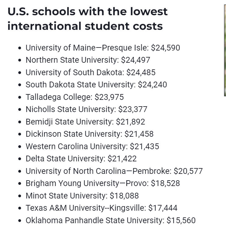 例如,根據(jù) U.S. News 的數(shù)據(jù),在 544 所至少招收 25 名國際學(xué)生的大學(xué)中,有 15 所每年的總費(fèi)用低于 24,600 美元。最低的費(fèi)用低至 15,560 美元,(不包括任何獲得的經(jīng)濟(jì)援助,包括學(xué)雜費(fèi)、食宿、書籍和交通)。
