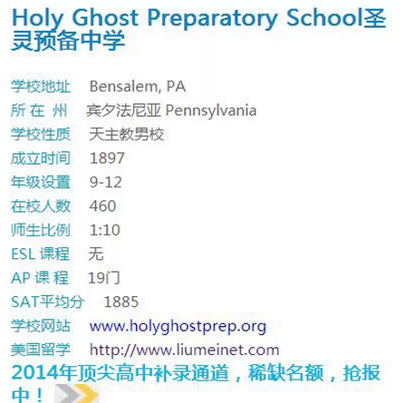 周末帶一個(gè)學(xué)生在建國(guó)門(mén)飯店參加了Holy Ghost 男校校方代表的初面。HolyGhost 這所學(xué)校前幾天有在空間介紹,很棒的一所學(xué)校,在美國(guó)大費(fèi)城地區(qū)的升學(xué)率排行中也位列前茅。想了解的朋友們查看具體介紹鏈接:http://0138.net.cn/school-final.php?id=1379&cat_id=1