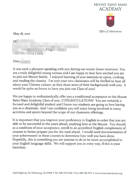 好消息:恭喜L同學(xué)成功補(bǔ)錄到Mount Saint Mary Academy!這個(gè)offer來(lái)之不易!留美網(wǎng)用效率、實(shí)力說(shuō)話!秉承誠(chéng)信為本!為每個(gè)孩子實(shí)現(xiàn)夢(mèng)想!祝L同學(xué)在美國(guó)學(xué)業(yè)有成!展翅高飛!
