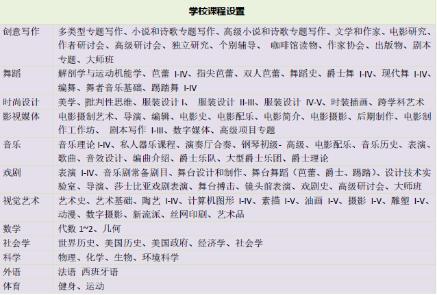 為了激勵年輕人的智力,并讓他們進(jìn)一步發(fā)展各個(gè)領(lǐng)域的知識,學(xué)校提供具有挑戰(zhàn)性的學(xué)科課程。小班制教學(xué)(一班大約15 位學(xué)生)、關(guān)懷仁愛的教職員,還有令人興奮的科目設(shè)計(jì)。藝術(shù)課程的教職員都是經(jīng)驗(yàn)豐富的專業(yè)人士,他們強(qiáng)調(diào)基本功的重要性,能夠幫助年輕的藝術(shù)家依自己的意愿獲準(zhǔn)進(jìn)入學(xué)院、大學(xué)、音樂學(xué)?;?qū)I(yè)藝術(shù)團(tuán)體。