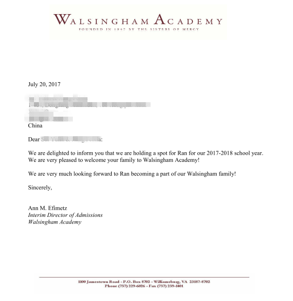 好消息:恭喜S同學成功補錄到頂尖高中Walsingham Academy,在時間很短的情況下,留美網(wǎng)老師克服種種阻力,在不到一周的情況下拿到了錄取offer,精心的面試培訓準備,漂亮的文書展現(xiàn),將S同學的亮點全部挖掘,面試當天拿到錄取offer,留美網(wǎng)在關鍵時刻用效率、實力說話,再次感謝留美網(wǎng)的全體員工!祝S同學在美國學業(yè)有成!展翅高飛!》》申請熱線:400-000-7805,微信:liumeinet2014