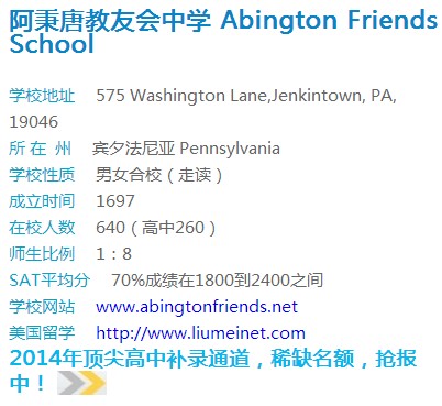 阿秉唐教友會中學 Abington Friends School位于美國歷史文化名城費城市,是集結多所美國高端學校的重要地理位置。該校擁有占地50多英畝的魅力校園和現代化建筑,坐落在市郊地區(qū),距離市中心10英里,距離美國首都華盛頓特區(qū)和紐約僅有兩個小時的車程。