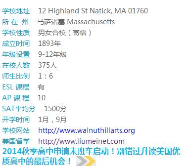 Walnut Hill School位于美國波士頓近郊,占地45英畝。它建立于1893年,是美國最古老的藝術(shù)高中之一,也是美國少數(shù)幾個臨近大都會的寄宿學(xué)校之一。胡桃山音樂學(xué)校為學(xué)生提供獨特的藝術(shù)和學(xué)術(shù)訓(xùn)練。學(xué)生在術(shù)科方面可以在芭蕾、創(chuàng)意寫作、音樂、戲劇與視覺藝術(shù)中選擇一門主修;同時也必須參與嚴格的學(xué)科課程。