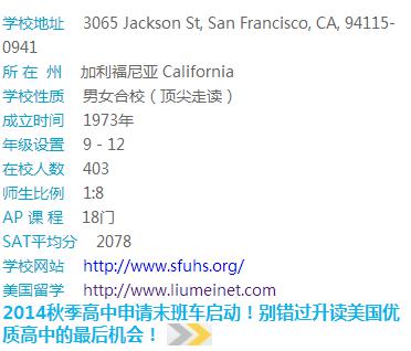 舊金山大學(xué)附屬中學(xué),創(chuàng)建于1973年,是一所私立走讀混合學(xué)校,提供9-12年級的教育。San Francisco University High School在全美私立走讀高中里屬于頂尖級別,SAT平均分高達2078分。