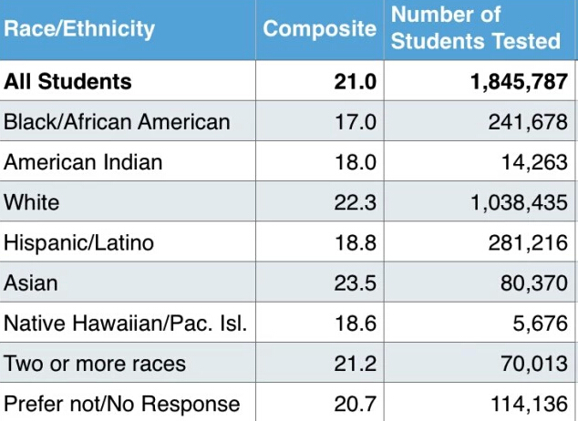 全美ACT考生的平均分是21.0分。其中,非裔美國學(xué)生的成績最低,平均只有17.0,拉美裔學(xué)生的平均分是18.8,白人學(xué)生的平均成績?nèi)〉昧?2.3分,但這還不是最高的,最高的平均分被亞裔學(xué)生占據(jù),成績是23.5。