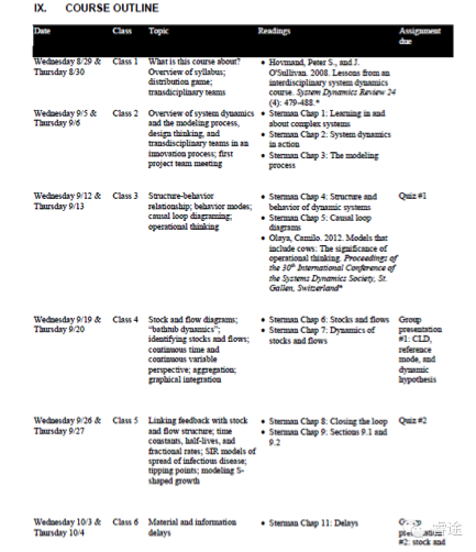 美國高校教授們則完全不一樣。以我所在的華盛頓大學(xué)為例,教務(wù)系統(tǒng)在每個(gè)學(xué)期開學(xué)前一周左右,就會(huì)推出本學(xué)期每一門課的教學(xué)大綱(syllabus),上面會(huì)詳細(xì)列出課程介紹、教學(xué)目標(biāo),以及本學(xué)期15-16次課的預(yù)習(xí)內(nèi)容、課堂主題、課后作業(yè)、考試時(shí)間等等,一目了然。所有的教授都會(huì)嚴(yán)格遵照這個(gè)既定的方針去推進(jìn)教學(xué)進(jìn)程,不會(huì)輕易中途改變授課節(jié)奏和順序,學(xué)生們可以放心地按照學(xué)期初就收到的教學(xué)大綱去規(guī)劃本學(xué)期的學(xué)習(xí)。如下圖,就是我們學(xué)院一門明星課程——系統(tǒng)動(dòng)力學(xué)在2012年秋季學(xué)期的教學(xué)大綱局部: