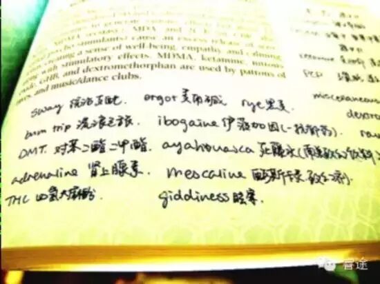 手寫字體是我的筆記。里面出現(xiàn)的對(duì)苯二酯二甲酯,四氫大麻酚,麥角堿,伊菠加因,死藤水和酶斯卡靈等,都是致幻劑的代表,而且教材中也詳實(shí)地提及了它們背后的歷史淵源、產(chǎn)業(yè)鏈與地區(qū)沖突?;蛟S有人不以為然:這些詞沒啥用吧!不是說GRE詞匯、SAT詞匯當(dāng)中有很大一部分是正常人的對(duì)話里根本用不上的嗎?我不由反問一句:當(dāng)你決定把自己送去美國,在美國的高校里掙扎在浩如煙海的專業(yè)文獻(xiàn)和應(yīng)接不暇的考試中時(shí),你的目標(biāo)是成為一個(gè)“正常人”,還是一個(gè)具備專業(yè)素養(yǎng)和自由精神的知識(shí)分子呢?如果是后者,那么無論你選擇哪一個(gè)學(xué)科,你的閱讀任務(wù)都不可能是通俗易懂的童話故事,生詞,甚至是艱深難懂、文化底蘊(yùn)深厚的生詞都是需要你補(bǔ)上的短板。