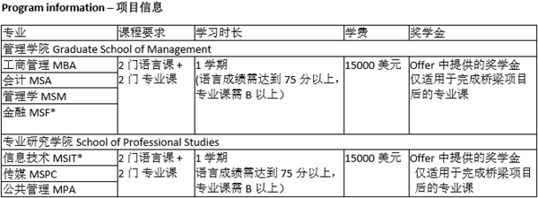 Program introduction – 橋梁項(xiàng)目簡介: 橋梁項(xiàng)目學(xué)制為一學(xué)期,學(xué)生需學(xué)習(xí) 2門專業(yè)課,2門語言課。語言課成績達(dá)到 75分,專業(yè)課成績達(dá) 到 B,即可直接專入專業(yè)課。如果學(xué)生未達(dá)到以上分?jǐn)?shù)要求,須再修一學(xué)期橋梁課,即可進(jìn)入正課。橋 梁項(xiàng)目最長要求為 2學(xué)期。橋梁項(xiàng)目中的 2門專業(yè)課學(xué)分計(jì)入正課專業(yè)課學(xué)分。 學(xué)生完成橋梁項(xiàng)目后,不需要再考 GMAT/GRE或者托福/雅思,直接進(jìn)入正式項(xiàng)目。 適用項(xiàng)目: a. 商科所有項(xiàng)目:會(huì)計(jì)、金融、管理學(xué)、MBA b. SPS: 公共管理、信息技術(shù)、傳媒