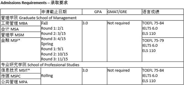 *管理學(xué)院中僅商業(yè)分析專業(yè)不提供橋梁項(xiàng)目,申請人可照常申請條件錄取,但需提供 GMAT/GRE 成績