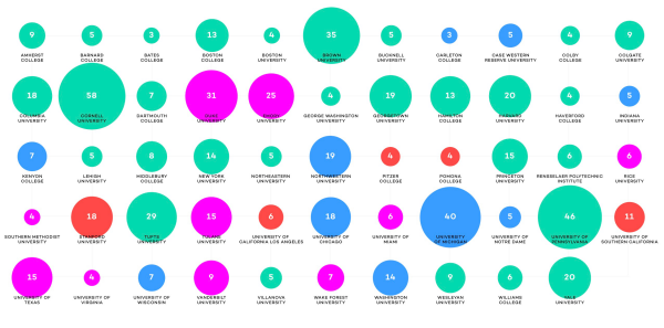 普林斯頓大學(xué)、哈佛大學(xué)、斯坦福大學(xué)、耶魯大學(xué)、杜克大學(xué)、約翰斯·霍普金斯大學(xué)、西北大學(xué)、賓夕法尼亞大學(xué)、康奈爾大學(xué)、芝加哥大學(xué)、布朗大學(xué)、哥倫比亞大學(xué)、達(dá)特茅斯學(xué)院、加州大學(xué)洛杉磯分校、加州大學(xué)伯克利分校、圣母大學(xué)、萊斯大學(xué)、范德堡大學(xué)、密歇根大學(xué)、華盛頓大學(xué)(圣路易斯)、紐約大學(xué)、埃默里大學(xué)、南加州大學(xué)、波士頓學(xué)院、波士頓大學(xué)、布蘭迪斯大學(xué)、喬治城大學(xué)、塔夫茨大學(xué)、杜蘭大學(xué)、威斯康星大學(xué)、威廉姆斯學(xué)院、斯沃斯莫爾學(xué)院、波莫納學(xué)院、阿默斯特學(xué)院、韋爾斯利學(xué)院、科爾蓋特大學(xué)、科爾比學(xué)院、明德學(xué)院、漢密爾頓學(xué)院、肯揚(yáng)學(xué)院、皮策學(xué)院、巴納德學(xué)院、衛(wèi)斯理大學(xué)、巴克內(nèi)爾大學(xué)等