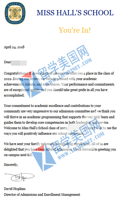 恭喜留美網(wǎng)同學(xué)補(bǔ)錄到頂尖寄宿 Miss Hall's School,在這里祝張同學(xué)前程似錦!學(xué)業(yè)有成!展翅高飛,美高補(bǔ)錄申請(qǐng)火爆進(jìn)行中,前三十的頂尖走讀和寄宿還有位子,申請(qǐng)熱線:400-000-7805,010-65183908,微信:liumeinet2014