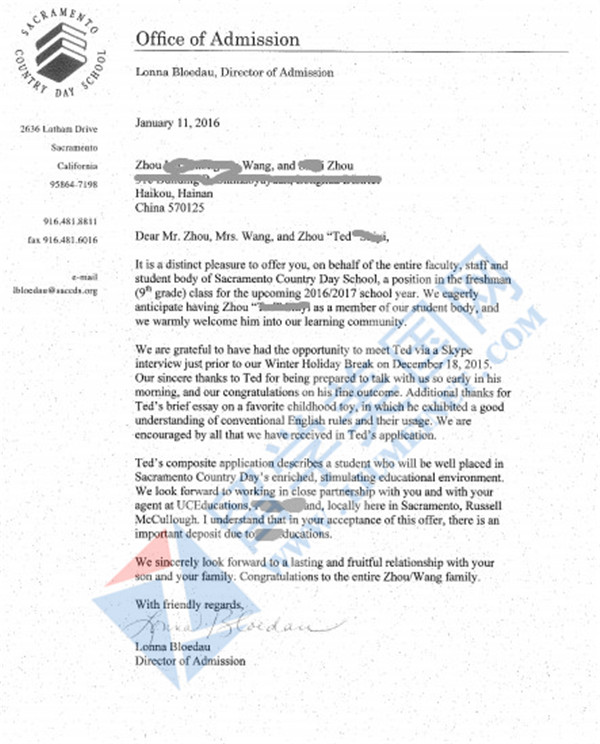 美國加州首府的薩克拉門托貴族學校(Sacramento Country Day School),位于加州首府的一所非宗教頂尖高中,里根總統(tǒng)兒子曾就讀該校。2015年,留學美國網(wǎng)的學生是該校年度的第一個錄取者,招生官曾到訪辦公室為學生提供專門面試。