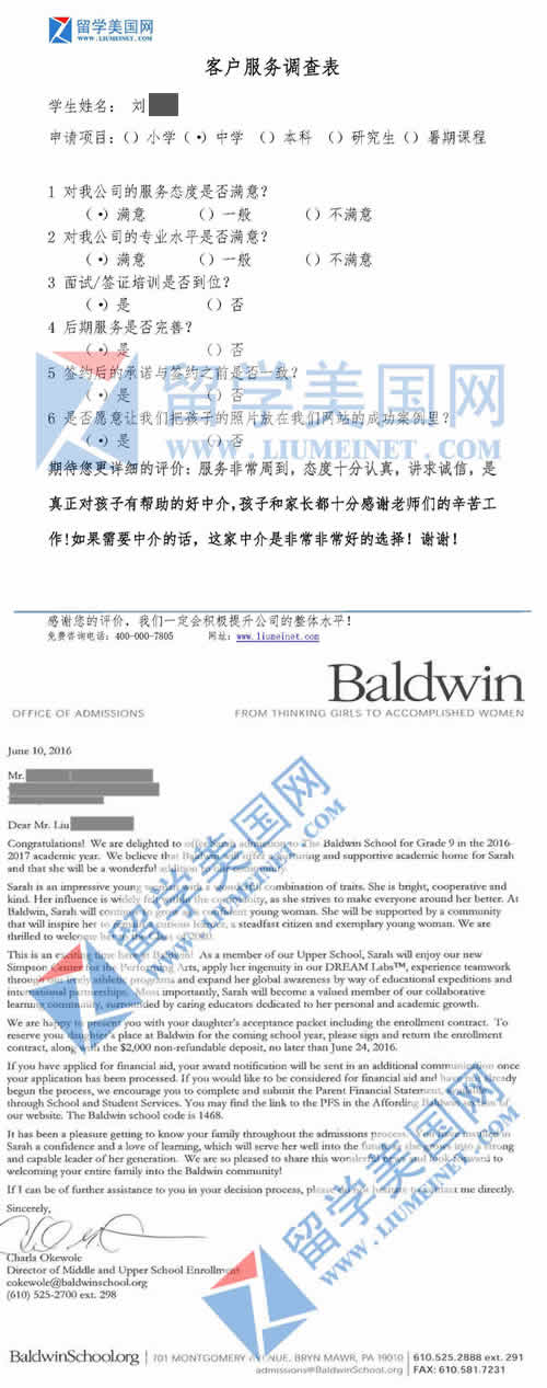 LYS同學的滿意評價表和鮑德溫女校錄取offer展示 【學??疾煸斍椤?/a>