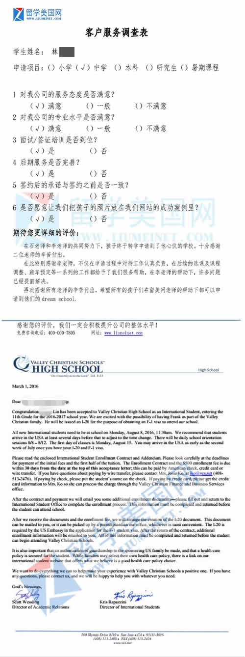 LYZ同學的滿意評價表和山谷基督中學錄取offer展示 【學校考察詳情】
