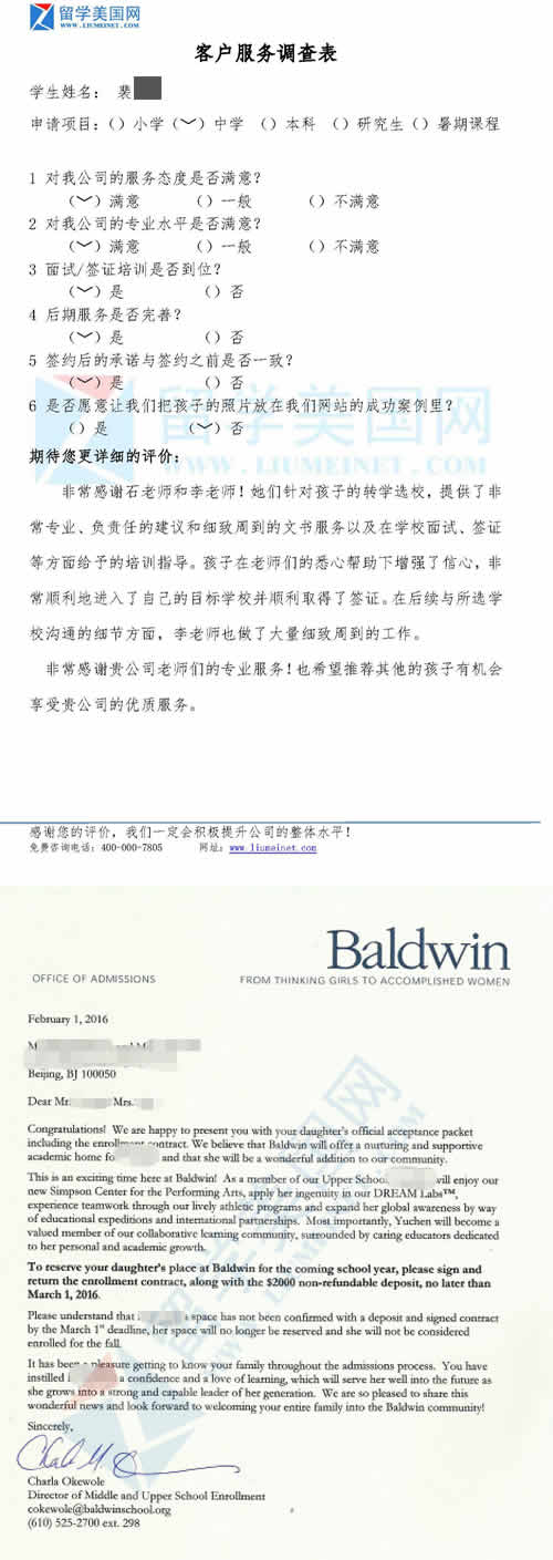 PYC同學的滿意評價表和鮑德溫女校錄取offer展示 【學??疾煸斍椤?/a>