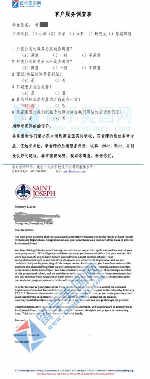 HZX同學的滿意評價表和波士頓圣約瑟夫中學錄取offer展示
