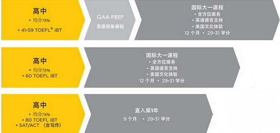 貫穿課程始終的英語語言和學(xué)術(shù)支持。該支持允許學(xué)生TOEFL iBT成績達(dá)到60分或同等水平,即可從中學(xué)直接升入美國學(xué)位課程(需滿足學(xué)術(shù)入學(xué)要求)。