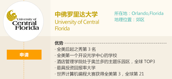 中佛羅里達(dá)大學(xué)(UCF)成立于1963年,坐落在陽光明媚的佛羅里達(dá)州奧蘭多市。學(xué)校占地1415英畝,擁有180座各類教學(xué)和辦公樓,學(xué)生來自全球148個(gè)國家和美國50個(gè)州。中佛羅里達(dá)大學(xué)是全美第二大大學(xué),在校生6萬1千多名。同時(shí),大學(xué)也擁有超高的就業(yè)率,畢業(yè)生就業(yè)排名全美第四位。學(xué)校不僅提供實(shí)習(xí)機(jī)會(huì),還設(shè)有各種學(xué)生社團(tuán)、體育俱樂部和運(yùn)動(dòng)隊(duì),更有出類拔萃的學(xué)術(shù)水平,這些因素共同促使UCF成為生活、學(xué)習(xí)和成長的最理想選擇。